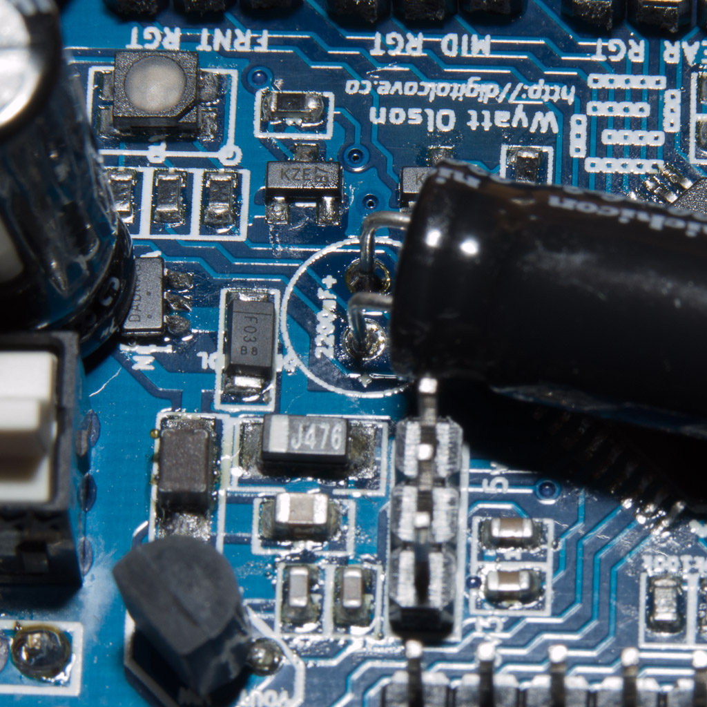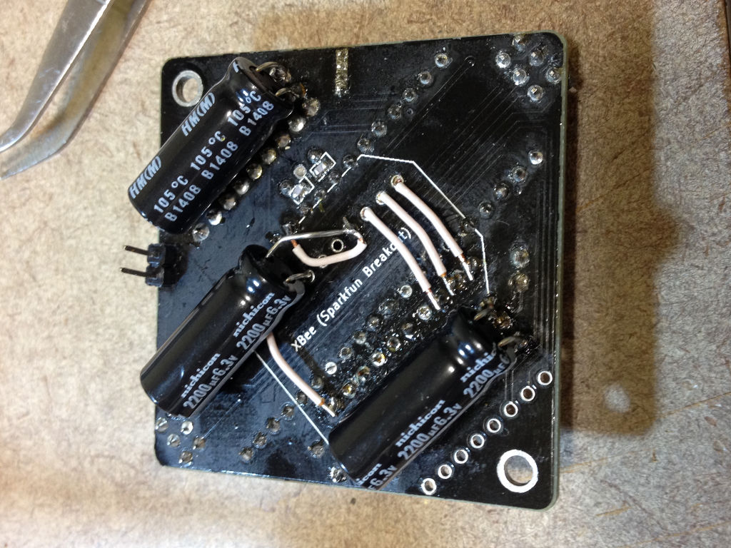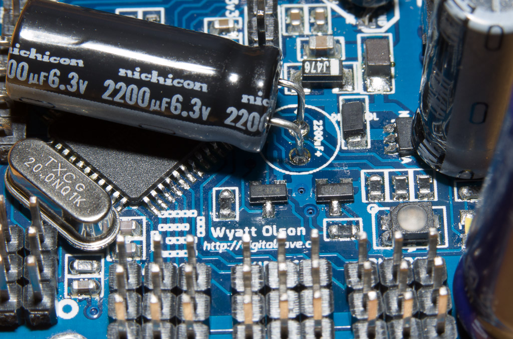 (I actually ended up moving the two 2200uF capacitors to the bottom of the board to keep things looking cleaner. Whatever works for you.)