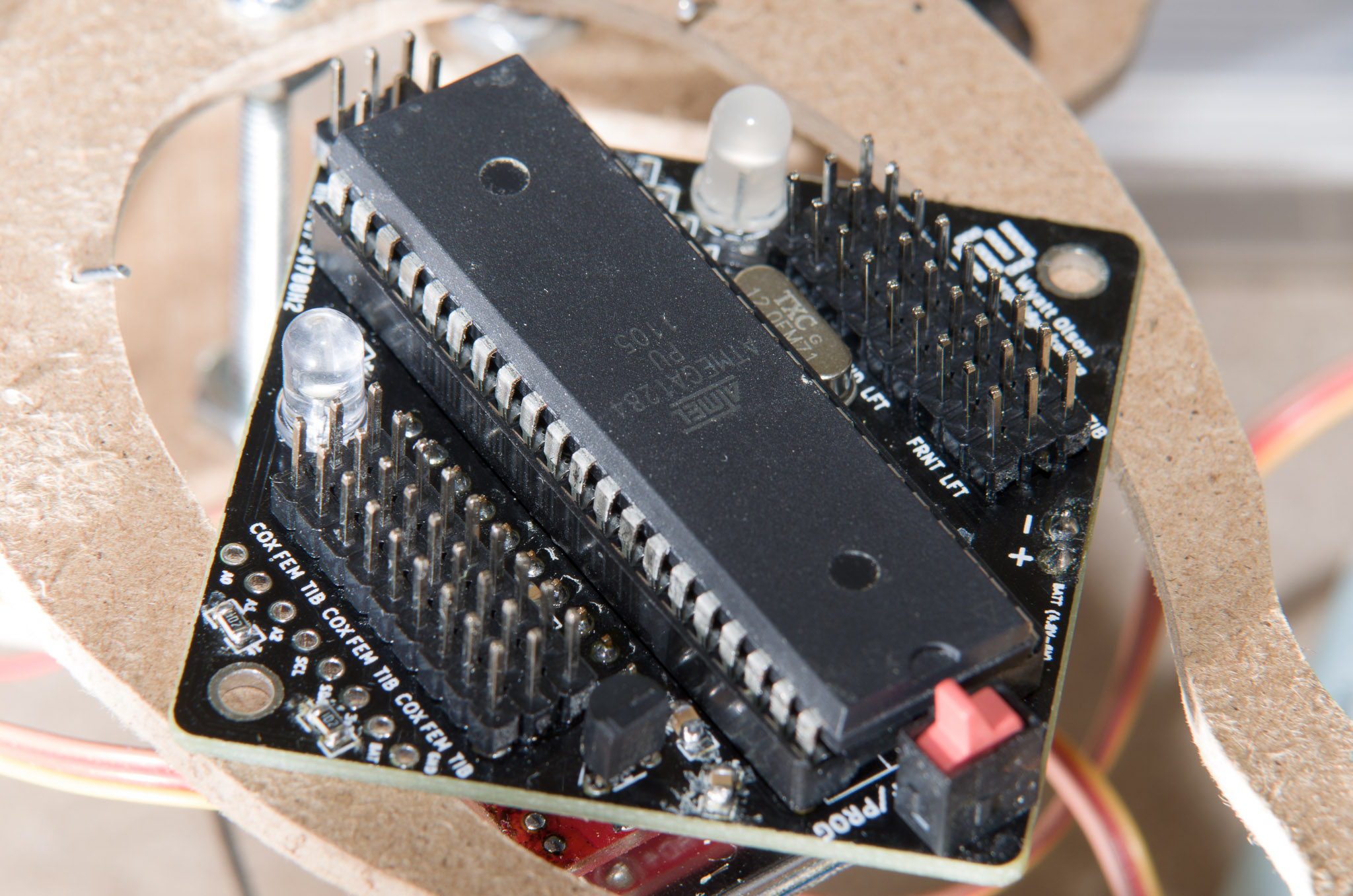 - Connect servos to the control board. The GND (brown on my servos) should connect to the outside of the board, and signal (orange) should connect to the inside of the board (the side closest to the AVR).