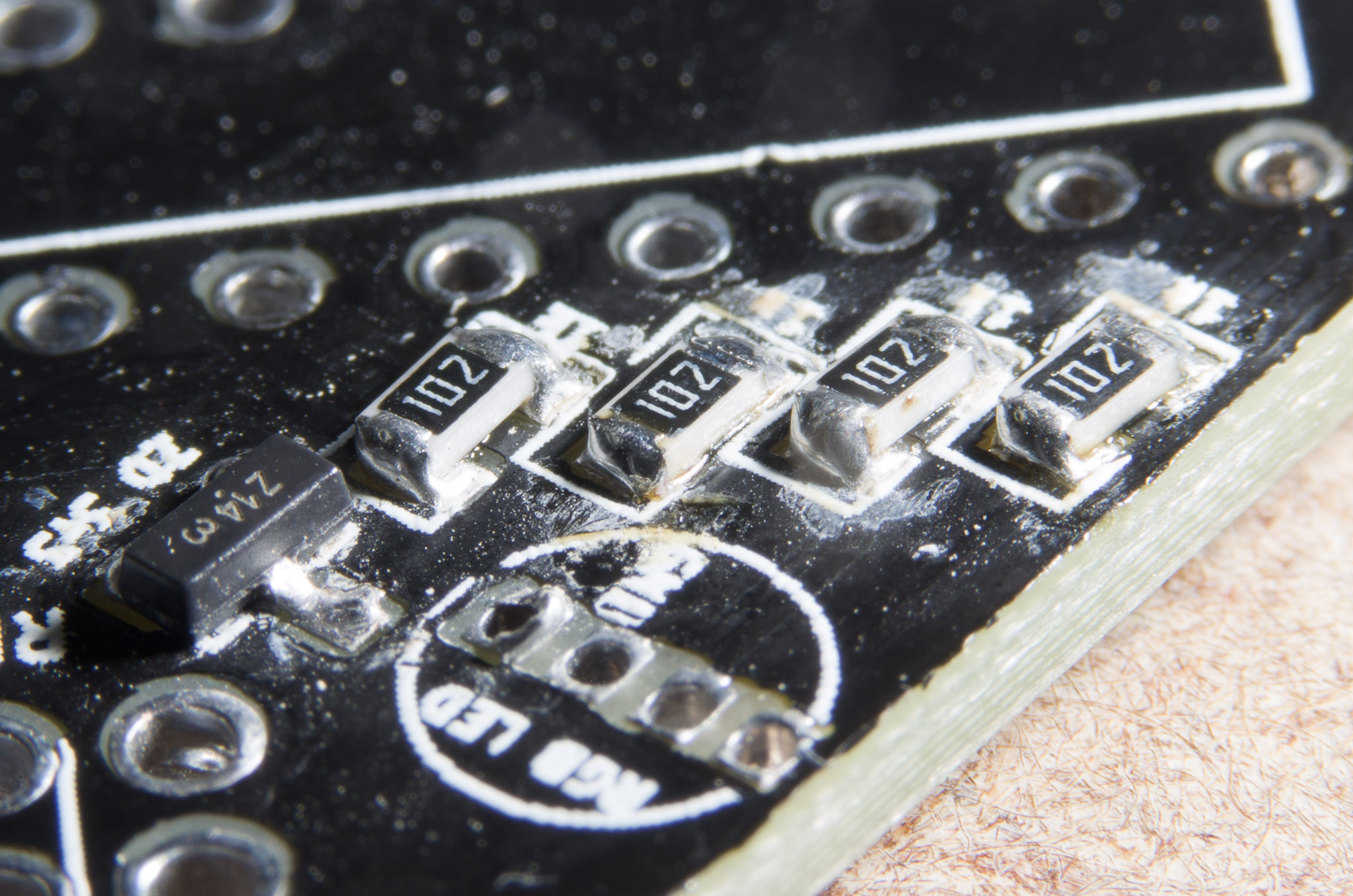 - Solder the SMD zener diode (the three pin SMD package). Use a similar approach as you did with the resistors, tinning one pin to secure it and then getting the others attached fully.