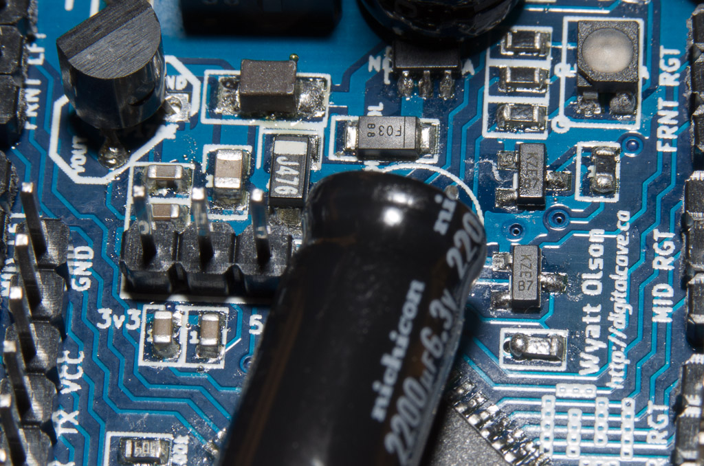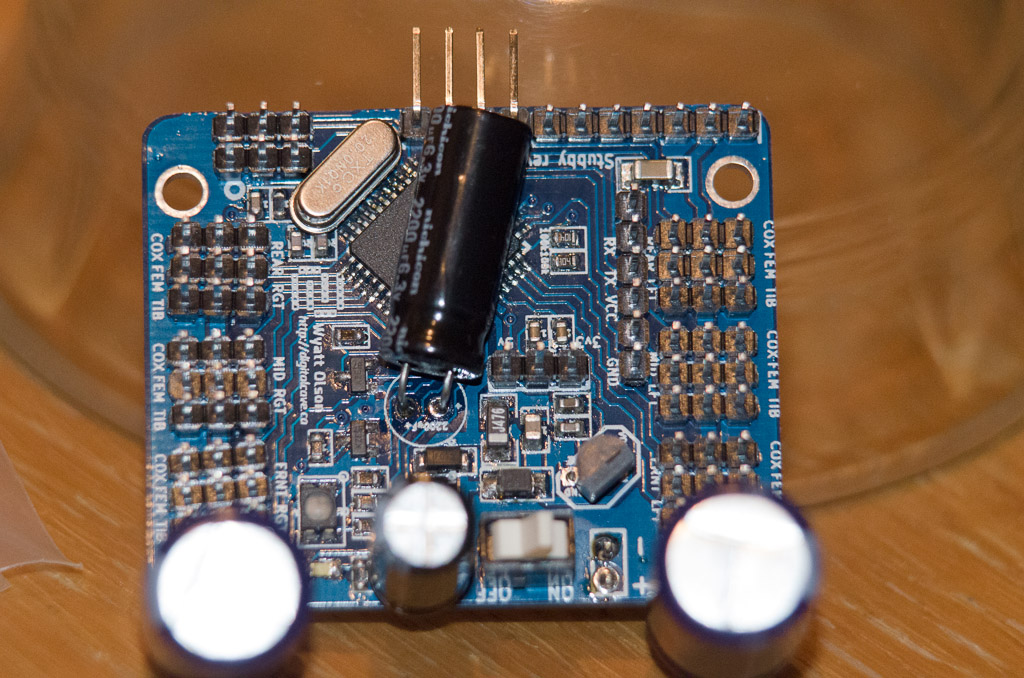 - To get a smoother power supply for both the servos as well as the AVR, you will probably want to put on some filtering capacitors. At a minimum, you should put a 470uF capacitor on the 3.3v line. If you are not planning on using the expansion port for anything else, you can put it there. Alternatively, you can put them right on the bottom of the board, in pseudo-surface mount style (this is what I did). It is a bit hard to see exactly what is happening here, but in short I have connected two capacitors to the GND / VBAT rails on each side of the board, with another one underneath, with jumper wires connecting it to GND / 3.3v: