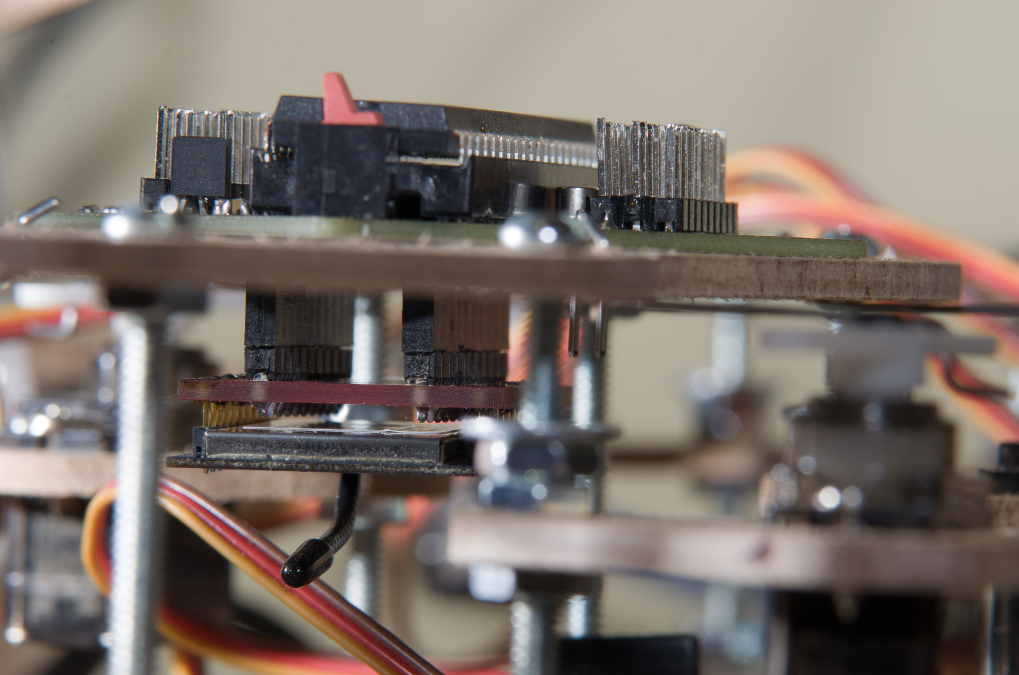 - Put the top layer (PCB layer) onto all six legs. Put lock nuts on top of each axle. Do not overtighten the nuts on the two spacer legs. All legs should be able to rotate freely.